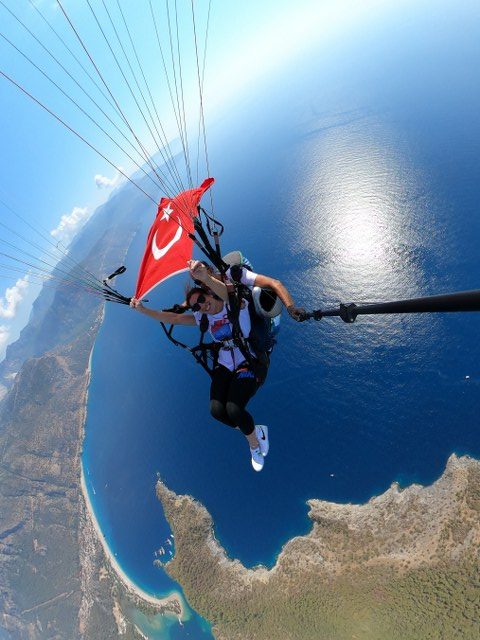 İlklerin kadını Yasemin Adar tatil için geldiği Fethiye de yamaç paraşütü ile atladı. Dünya ve Avrupa güreş şampiyonu ve kadın güreşte Türkiye’ye ilk Olimpiyat madalyasını kazandıran “İlklerin kadını” yamaç paraşütü ile uçarken Türk Bayrağımızı da açıp gökyüzünde dalgalandırdı. Geçtiğimiz aylarda Erdem Yiğit ile evlenen şampiyonlar şampiyonu Türk güreşçisi “Bayrağımızı daha önce şampiyonalarda dalgalandırmıştım.Şimdi de gökyüzünde dalgalandırdım çok mutluyum” ifadelerini kullandı.