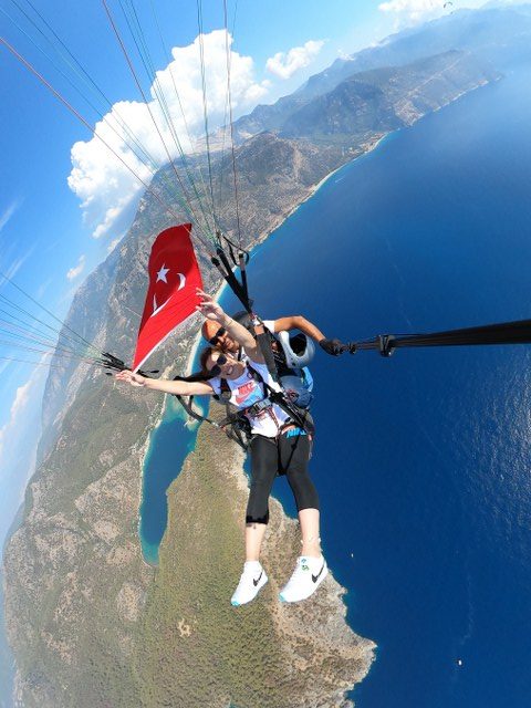 Fethiye’ye Salih Eroğlu ve Güler Alpmanın misafiri olarak eşi Erdem Yiğit ile birlikte gelen ilklerin kadını Yasemin Adar Yiğit Babadağ dan Ölüdenize yamaç paraşütü ile atlayış gerçekleştirdi. Avrupa şampiyonu ve ilk Dünya şampiyonu,2021 Tokyo Olimpiyatları 3.sü kadın güreşinde ilklerin kadını Yasemin Adar Yiğit Ölüdeniz de gökyüzünde kelebekler gibi uçan yamaç paraşütlerini görünce uçmak istedi. Butterfly şirketine başvuran ilklerin kadını tecrübeli pilot Zafer Şekerci den gerekli info alıp teleferikle Babadağ’a çıktı.Bin 700 metredeki pistte gerekli hazırlıklar yapıldıktan sonra başarılı bir atlayış gerçekleşti. Gökyüzünde adrenalin den dolayı büyük sevinç aşayan ilklerin kadını Türk bayrağımızı açtı. Gökyüzünden Tüm Türkiye’ye seslenen Yasemin Adar Yiğit” Türkiye Cumhuriyeti bayrağımızı yurt Dışında dalgalandırmıştım. Şimdide gökyüzünde dalgalandırmaktan çok mutluyum. Herkesin yamaç paraşütü ile uçmasını öneriyorum” diye konuştu. Tecrübeli pilot Zafer Şekerci de” Avrupa ve Dünya Şampiyonumuz ile birlikte uçmak harikaydı. Hiç korkmadı.Gökyüzünde kahkahalar attı sevinçten. Yanında getirdiği Türk bayrağımızı dalgalandırdı. Yine uçmaya geleceğini söyledi” ifadelerini kullandı.