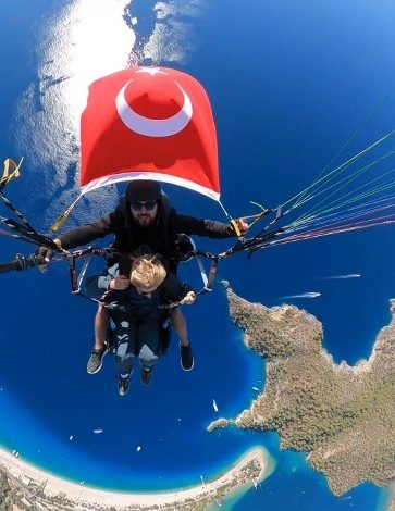 Fethiye’de Cumhuriyet Bayramı coşkulu şekilde kutlanırken, tandem yamaç paraşütü pilotu Rıdvan Mekik de yolcusu Alp Ergüden ile gökyüzünde Türk bayrağı açarak kutladı.