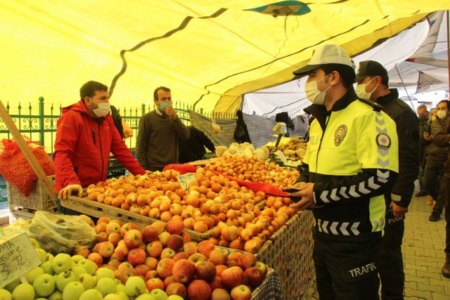 Salı pazarında denetim gerçekleştiren İlçe Emniyet Müdürlüğü ekipleri, maske takmayanlara ve açık alanda sigara içenlere cezai işlem uyguladı.