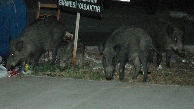 Fethiye’ye bağlı Taşyaka Mahallesi’nde geçtiğimiz günlerde yaban domuzu sürüsü gece geç saatlerde sokaklara inerek yiyecek aradı. Çöp konteynırlarının etrafında sürüler halinde gezinen domuzlar, vatandaşlar tarafından cep telefonuyla kayda alındı. İnsanların sokakta çok sık bulunmadığı geç saatlerde rahatça mahallede gezen domuzlar, bir süre sonra dağlık alana doğru ilerleyerek gözlerden kayboldular.                             Haber-Foto/Hakan AYKIRI