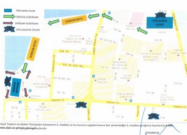 Fethiye Kaymakamlığı tarafından yapılan yazılı açıklamada; ilçedeki toplantı ve gösteri yürüyüşleri güzergahları belirlendiği ifade edildi. Temel Hak ve Hürriyetlerin Geliştirilmesi Amacıyla Çeşitli Kanunlarda Değişiklik Yapılmasına Dair 6529 sayılı Kanun ile 2911 sayılı Toplantı ve Gösteri Yürüyüşleri Kanununu 6. maddesinde yapılan değişiklik kapsamında; Fethiye’de oluşturulan Açık ve Kapalı Yer Toplantı Alanları ve Dağılma Noktaları, Gösteri Yürüyüş Toplanma Alanları ve Yürüyüş Güzergahları tespit edildi.
