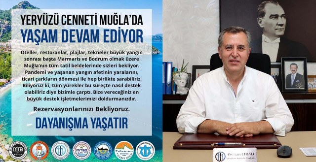Duyuruda; “Oteller, restoranlar, plajlar, tekneler büyük yangın sonrası başta Marmaris ve Bodrum olmak üzere Muğla’nın tüm tatil beldelerinde sizleri bekliyor. Pandemi ve yaşanan yangın afetinin yaralarını, ticari çarkların dönmesi ile hep birlikte sarabiliriz. Biliyoruz ki, tüm yürekler bu süreçte ‘Nasıl destek olabiliriz’ diye bizimle çarptı. Bize vereceğiniz en büyük destek işletmelerimizi doldurmanızdır. Rezervasyonlarınızı bekliyoruz. Dayanışma yaşatır” ifadelerine yer verildi.